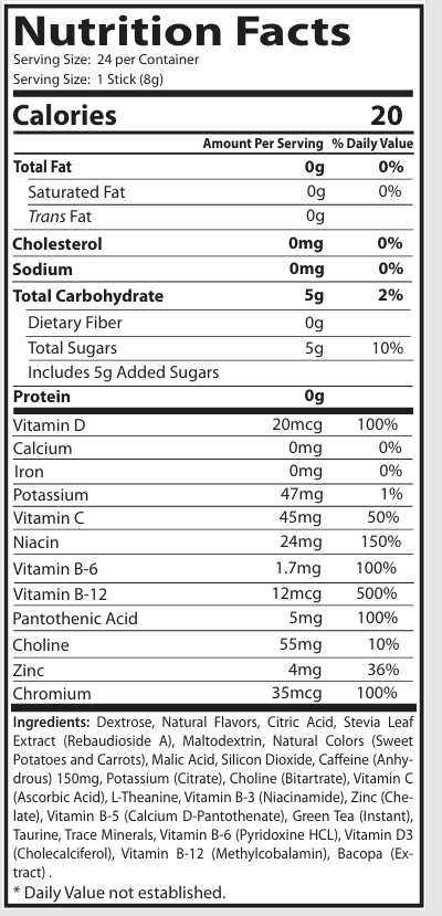 Mix one 8g stick pack into 12-16 oz of water, shake or stir, and fuel up with great-tasting energy